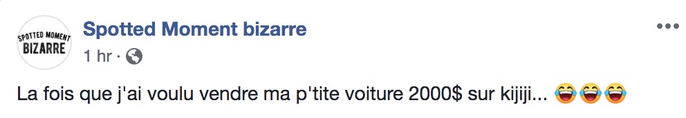 Il y a souvent des publications assez divertissantes sur la page Spotted Moment bizarre. Ils viennent de partager la discussion entre un homme qui vend son auto sur Kijiji et un acheteur. Celui-ci offre la moitié du prix demandé pour la Chevrolet Aveo 2009, et il pense que la vente est conclue. La réponse du vendeur est excellente (le numéro de téléphone est celui du Clan Panneton).