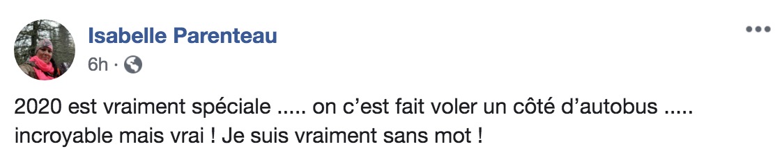 Isabelle Parenteau a partagé une publication qui fait réagir énormément sur le web. La femme a mis en ligne 2 photos d’un autobus scolaire en disant: «2020 est vraiment spéciale ….. on c’est fait voler un côté d’autobus ….. incroyable mais vrai ! Je suis vraiment sans mot ». On peut voir un autobus qui manque un côté au complet. Isabelle affirme que le véhicule se trouvait à Acton près de Drummondville. Plusieurs internautes trouvent la situation bien comique, mais d’autres personnes doutent que c’est bien vrai!