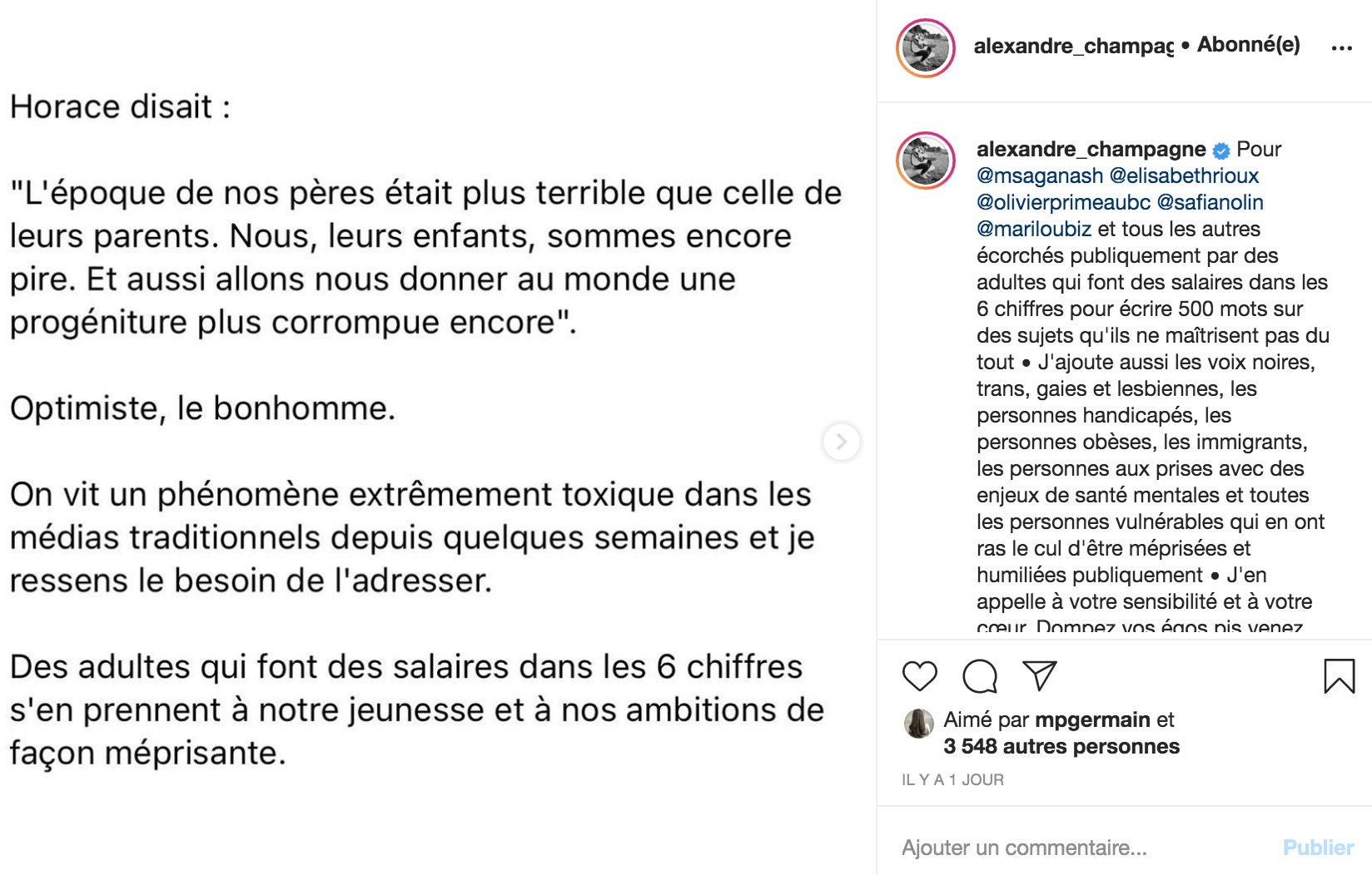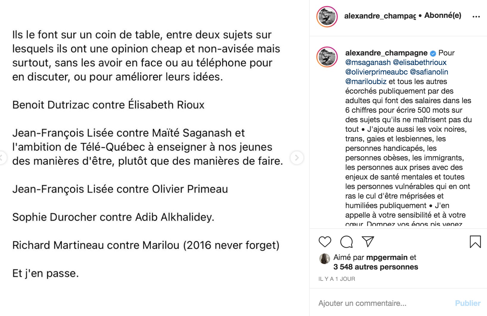 Alexandre Champagne a décidé de faire une longue publication pour donner son point de vue sur différents chroniqueurs / personnalités publiques qui font des commentaires percutants au sujet de plusieurs personnalités artistiques plus jeunes. En publiant son message en différentes photos Instagram, il a écrit dans la légende: