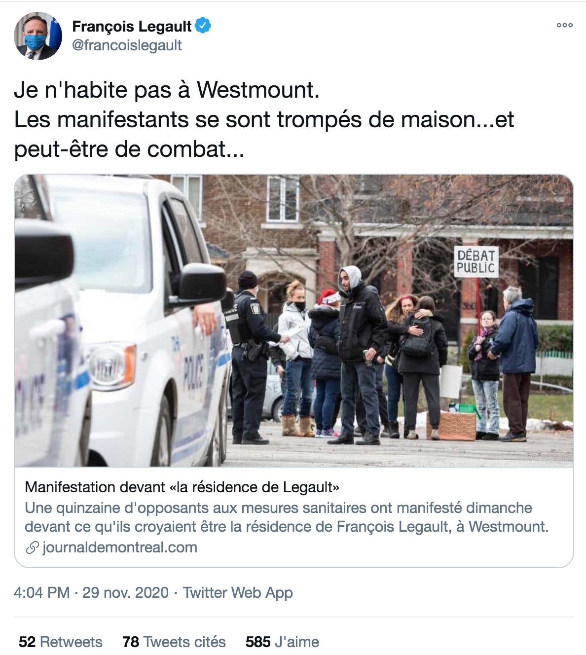 Une quinzaine de personnes ont manifesté contre les mesures sanitaires dimanche après-midi devant «la maison de François Legault». En fait, les gens n’étaient aucunement devant la maison du premier ministre. François Legault a partagé un article sur le sujet en écrivant: «Je n’habite pas à Westmount. Les manifestants se sont trompés de maison…et peut-être de combat…». (via Clique du plateau)