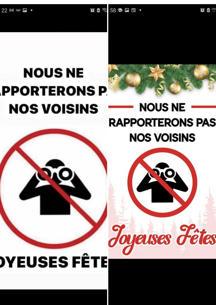 Sébastien crée des pancartes à mettre devant sa maison mentionnant: «Nous ne rapporterons pas nos voisins, joyeuses fêtes» avec un bonhomme qui regarde dans ses jumelles d’observation dans un signe d’interdiction. On peut voir dans sa publication qu’il en a mis une devant chez lui et qu’il prend les commandes.