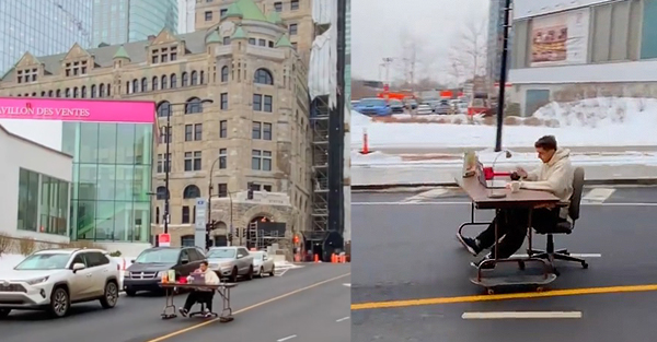 L’Instagrammeur montréalais Parkourporpoise se spécialise dans des défis assez audacieux. Dans sa plus récente vidéo, il a décidé de faire du télétravail tout en descendant la rue Peel. Tu peux le voir sur sur sa chaise avec son bureau roulant dans le centre-ville de Montréal. Il semble que cette cascade n’a pas causé d’accident même si on ne voit pas la fin de la vidéo. On remarque que le jeune homme essaie de freiner avec ses pieds à la fin, et ça n’a pas l’air de fonctionner. Ce n’est pas la première fois que @Parkourporpoise fait des vidéos de la sorte, on a pu le voir dans une mini auto avec un habit de Mario Bros ou encore se faire tirer par un autobus en faisant du snowboard. (via Sac de chips)