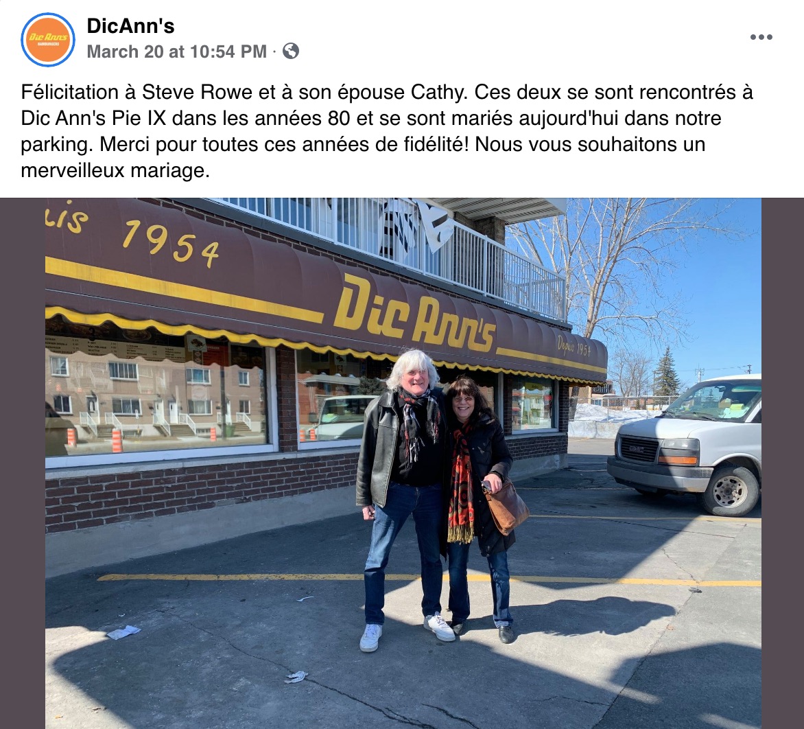 La chaîne de restaurants Dic Ann’s a partagé sur Facebook une petite anecdote / nouvelle. On peut voir sur la photo Steve Rowe ainsi que son épouse Cathy qui viennent de se marier dans le stationnement du restaurant. Les deux amoureux se sont rencontrés au Dic Ann’s sur le boulevard Pie IX dans les années 80. Un beau clin d’oeil à leur rencontre et une belle idée de mariage! On peut lire dans la publication ce message: «Félicitation à Steve Rowe et à son épouse Cathy. Ces deux se sont rencontrés à Dic Ann’s Pie IX dans les années 80 et se sont mariés aujourd’hui dans notre parking. Merci pour toutes ces années de fidélité! Nous vous souhaitons un merveilleux mariage.».