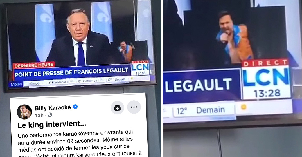 Billy Karaoké est tout un personnage sur le web. Extrêmement aimé et suivi par énormément de fans sur Facebook, il est toujours là pour défendre les droits du karaoké. On se souvient qu’il s’était accroché à un panneau publicitaire du 98,5 FM pour avoir une entrevue avec Paul Arcand ou encore il s’était enchaîné devant les bureaux de TVA pour avoir son moment avec Denis Lévesque. Ce coup-ci, il est apparu pendant 9 secondes lors du point de presse de François Legault.