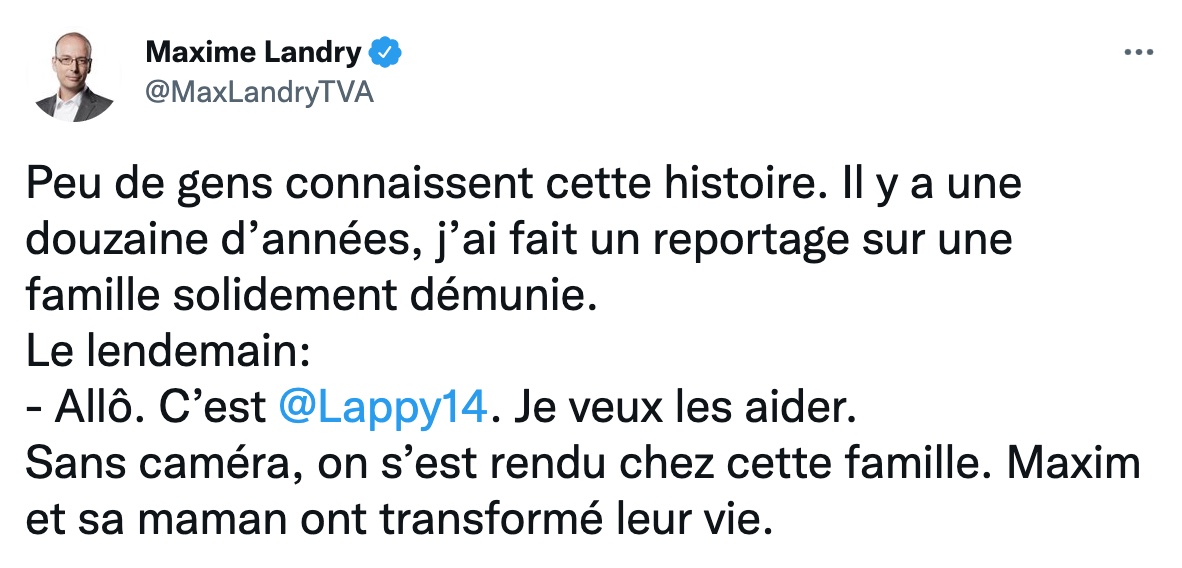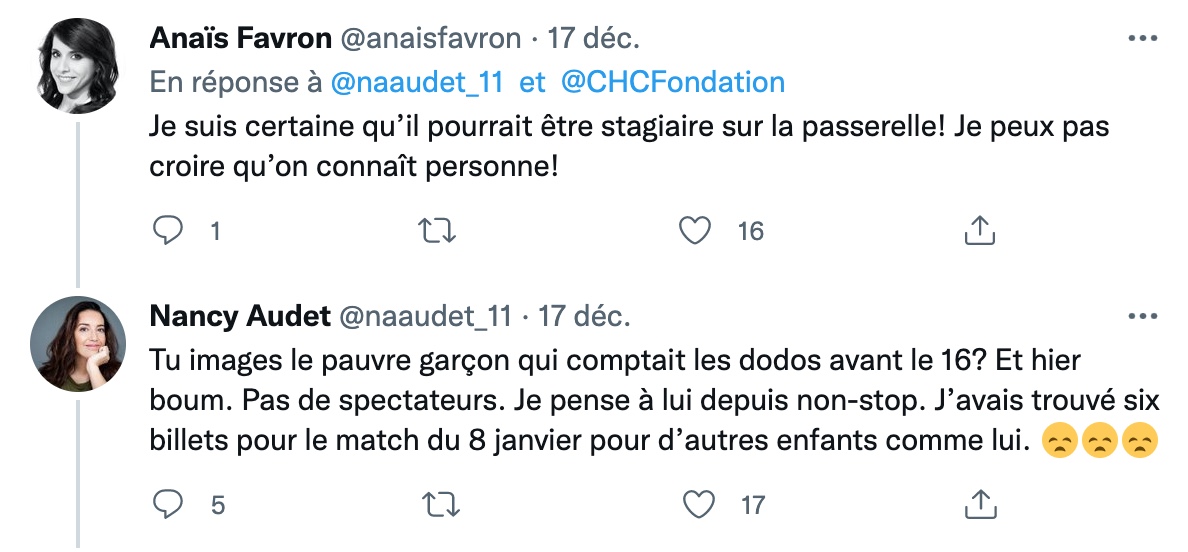 Maxim Lapierre s’est tout de suite proposé de prendre cette situation en main ainsi que plusieurs autres internautes. Finalement la Fondation des Canadiens pour l’enfance a répondu à l’appel et on peut lire dans une autre publication de Nancy Audet: « Miracle de Noël. La @CHCFondation va préparer un cadeau pour le garçon qui n’a pu vivre son rêve d’assister à un match du Canadien hier soir. Elle va aussi l’inviter quand la situation le permettra. Merci chère Fondation. ».