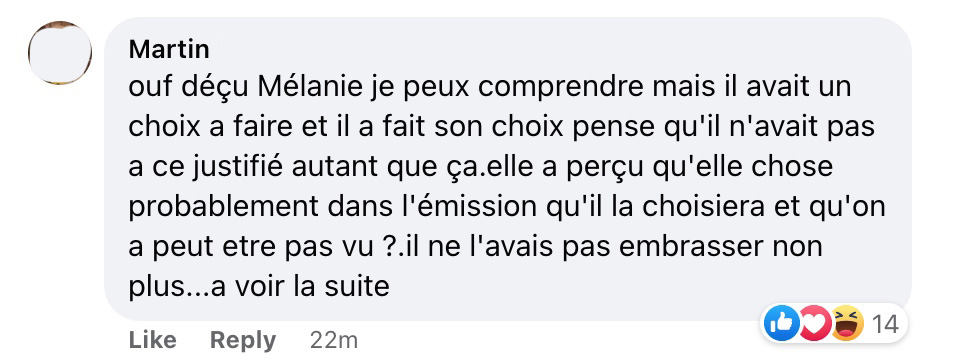 L’équipe de l’émission L’amour est dans le pré a mis un long extrait de la discussion entre Marc-Antoine et Mélanie. On se souvient lors du plus récent épisode, on pouvait avoir seulement le début de l’échange. Mélanie désire comprendre le choix de Marc-Antoine, la suite disponible ce soir.