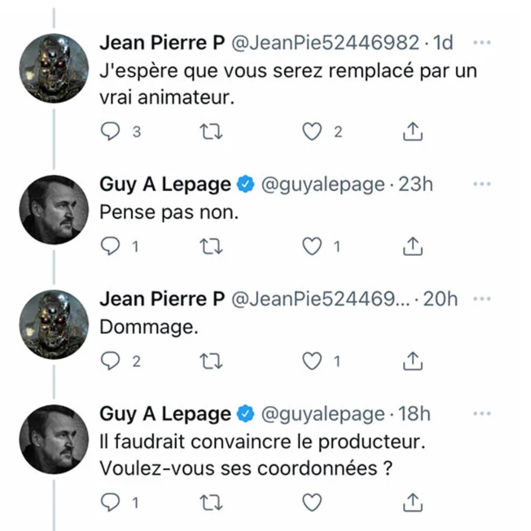 Un internaute a commenté le tout en souhaitant à Guy A Lepage qu’il soit remplacé l’année prochaine. Guy a répondu à la personne pour lui dire qu’il allait être là et qu’il peut parler au producteur de l’émission. L’homme termine l’échange en demandant à Guy de s’auto-congédier! (via Conneries QC)