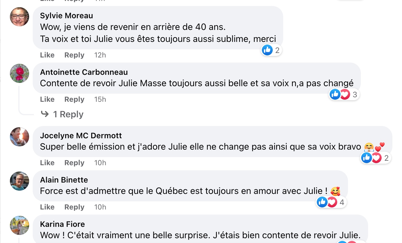 France Beaudoin a fait toute une surprise à Isabelle Boulay lors de l’émission En direct de l’univers. C’est Julie Masse qui est montée sur scène pour chanter C’est zéro. On peut dire que la réaction d’Isabelle est parfaite, elle était tellement surprise de voir Julie interpréter ce hit.