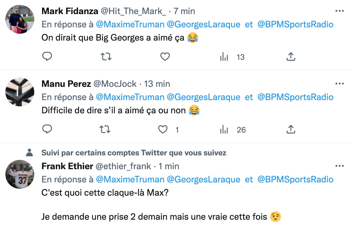 Ma job aujourd’hui : donner une claque dans ‘face à @GeorgesLaraque alors qu’on est en ondes (@BPMSportsRadio)…