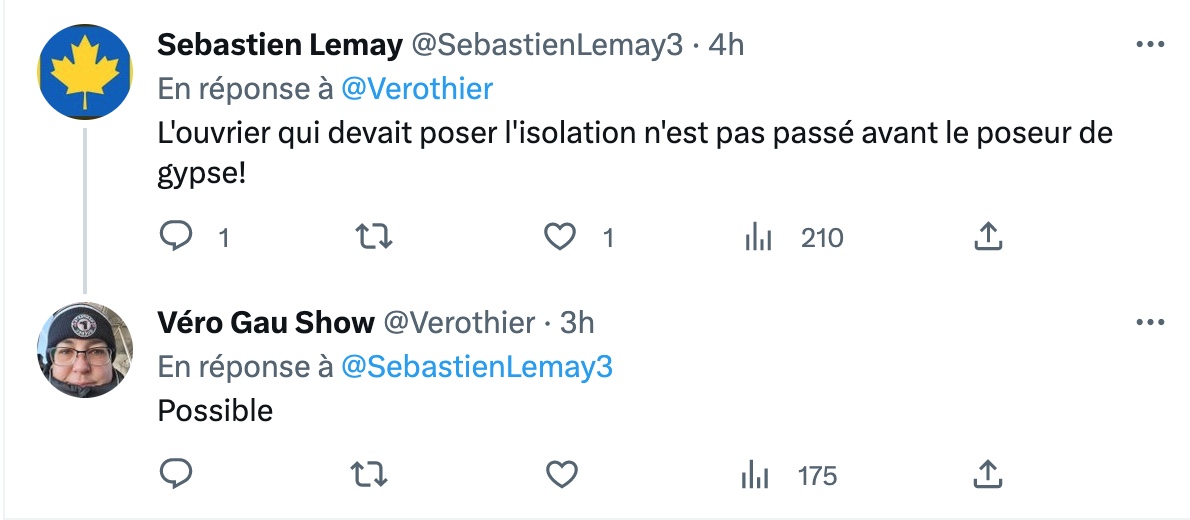 Véro a écrit en publiant sa photo: « Checker ça. Quand je dis que l’isolation de notre appartement est vraiment à chier…C’est de la glace sur la prise de courant au dessus du comptoir. Je veux ben croire que c’est pas un froid ordinaire mais quand même, c’est pas normal! Une chance qu’on a le chauffage inclus! »