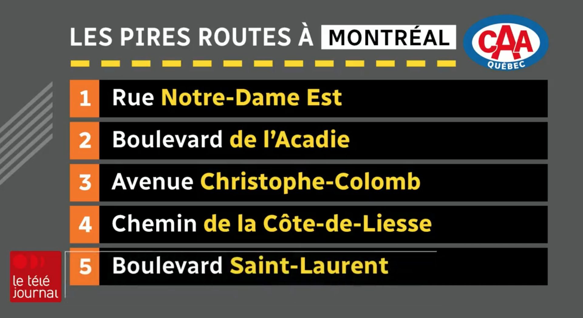CAA Québec a fait son palmarès des pires routes du Québec et la ville de Montréal est absente du classement. On retrouve en 5e position le Chemin Sainte-Foy à Québec, 4e position le Chemin Cook à Gatineau, en 3e position la Route des Fondateurs à Larouche et en 2e position la Route 329 à Saint-Adolphe-d’Howard.