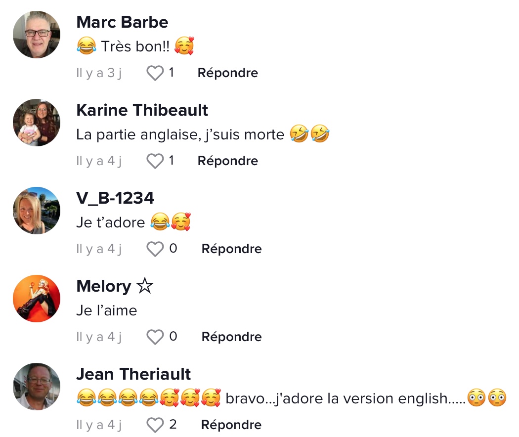 Vickie Pedneault alias Biolovik sur TikTok fait fureur sur le web présentement avec sa vidéo d’une agente de bord. Elle donne les consignes dans l’avion avec un accent très prononcé. Tout le monde est sous le charme de son accent saguenéen mélangé avec de l’anglais.