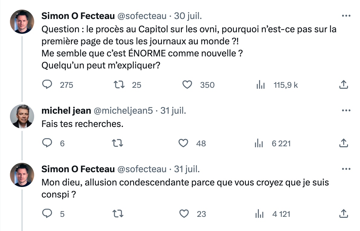 Michel Jean a aussi répondu à une question de Simon Olivier Fecteau et sa réponse a surpris le réalisateur du Bye Bye. On pouvait lire dans le message de Simon Olivier: Question : le procès au Capitol sur les ovni, pourquoi n’est-ce pas sur la première page de tous les journaux au monde ?! Me semble que c’est ÉNORME comme nouvelle ? Quelqu’un peut m’expliquer?