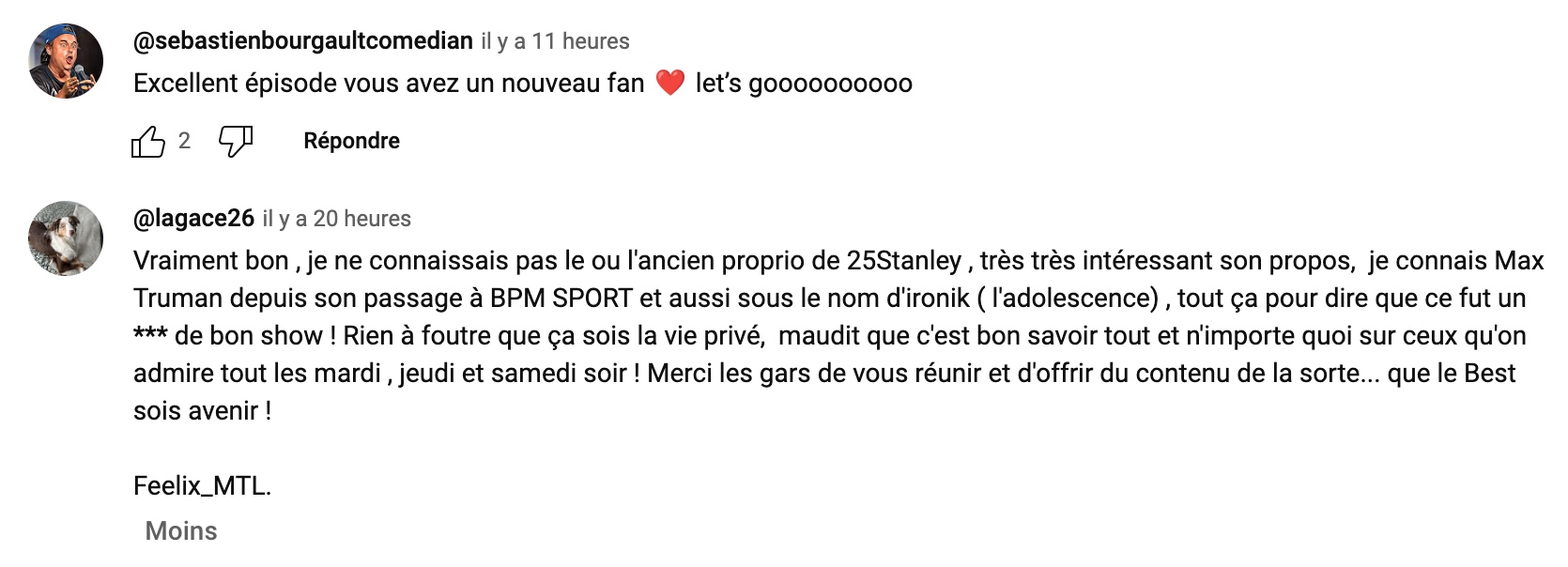 Maxime Truman de l’excellent blogue Dans les coulisses et JT Utah d’InstaHabs viennent de lancer un nouveau podcast sur le monde du hockey. Le premier épisode fait sensation présentement sur le web, le franc-parler des 2 animateurs est la clé de leur succès. Ils abordent plusieurs sujets entourant les Canadiens de Montréal: des scoops qu’ils ont sortis, des chicanes, la vente du blogue 25Stanley, l’alcool et les joueurs… Les 45 minutes du podcast passent en un claquement de doigts. Pas le choix de féliciter les 2 blogueurs, on leur souhaite bonne chance dans cette aventure.