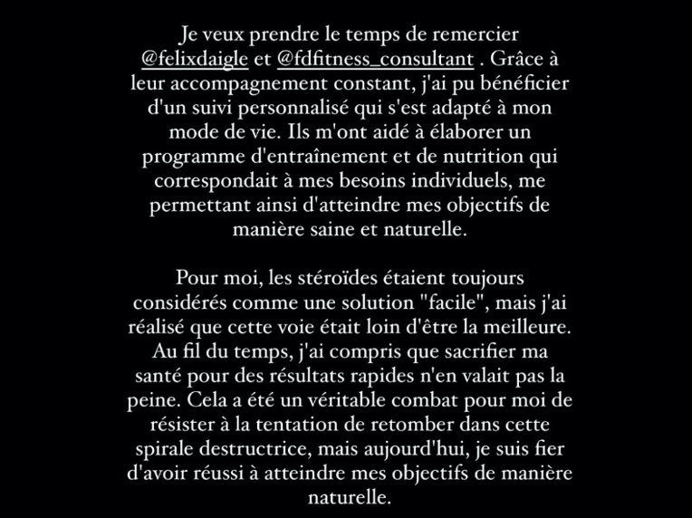 On peut lire dans une publication: « Il y a six ans, je me suis lancé dans le monde de la compétition de bodybuilding avec une conviction profonde: la croyance que la perte de poids et le dépassement de soi ne pouvaient être atteints qu’avec l’aide de stéroïdes et de produits dopants. Cette perception erronée était ancrée en moi, et je pensais sincèrement que c’était la seule voie possible pour atteindre mes objectifs. ». (via Conneries QC)