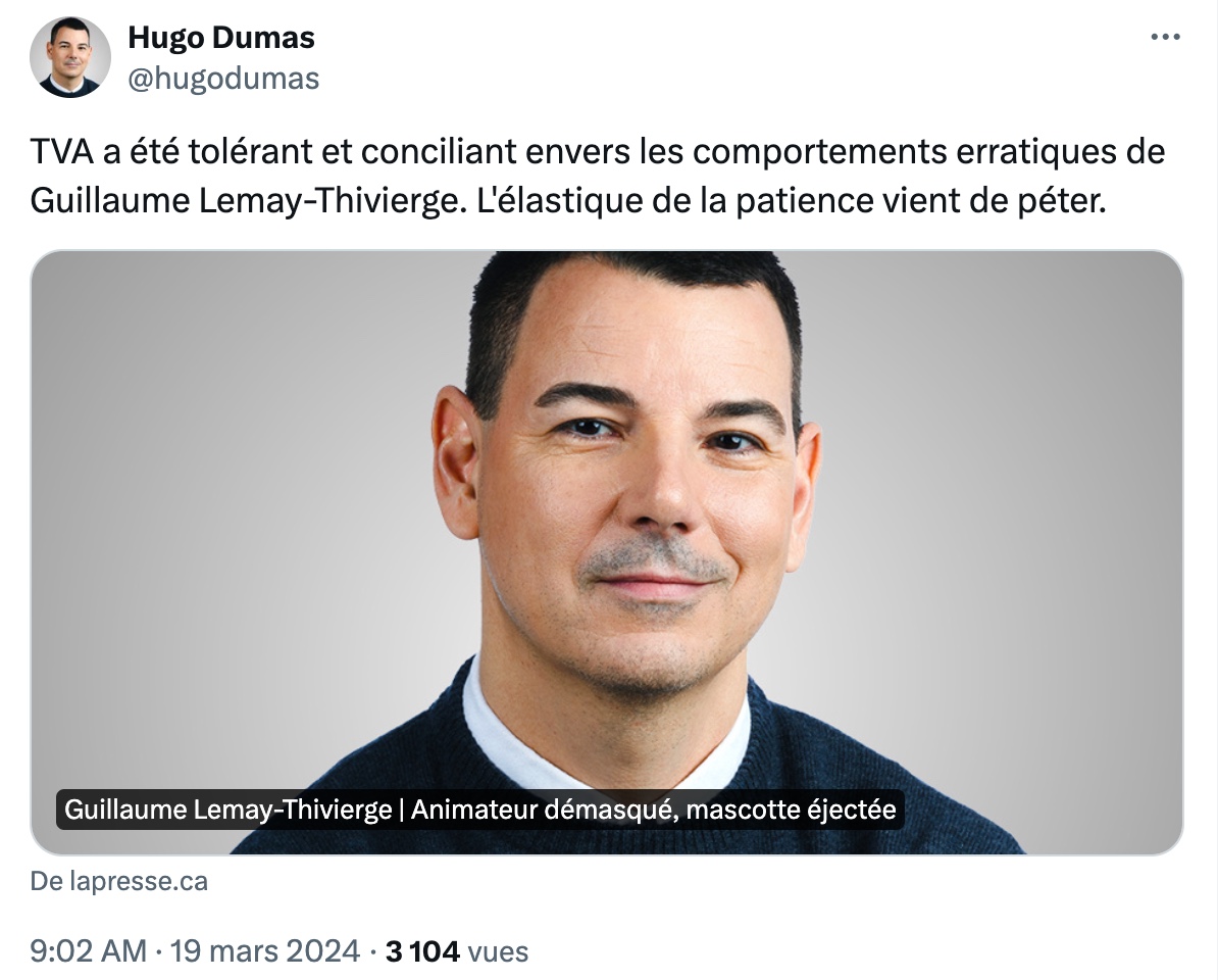 Voici le segment de l’émission Tout le monde en parle qui a abordé toute la saga de Guillaume Lemay-Thivierge. C’est le co-animateur Pierre-Yves Lord qui se prononce avec justesse sur toute l’histoire. Guy A Lepage aussi aborde le sujet rapidement en disant simplement un mot.