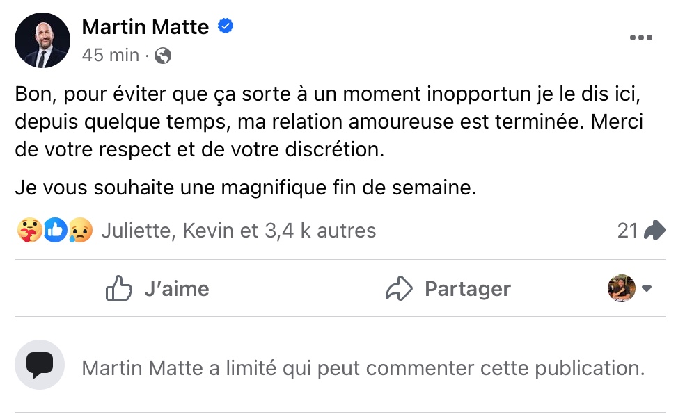 Dans le message publié par Martin, on peut lire: « Bon, pour éviter que ça sorte à un moment inopportun je le dis ici, depuis quelque temps, ma relation amoureuse est terminée. Merci de votre respect et de votre discrétion. Je vous souhaite une magnifique fin de semaine. ».