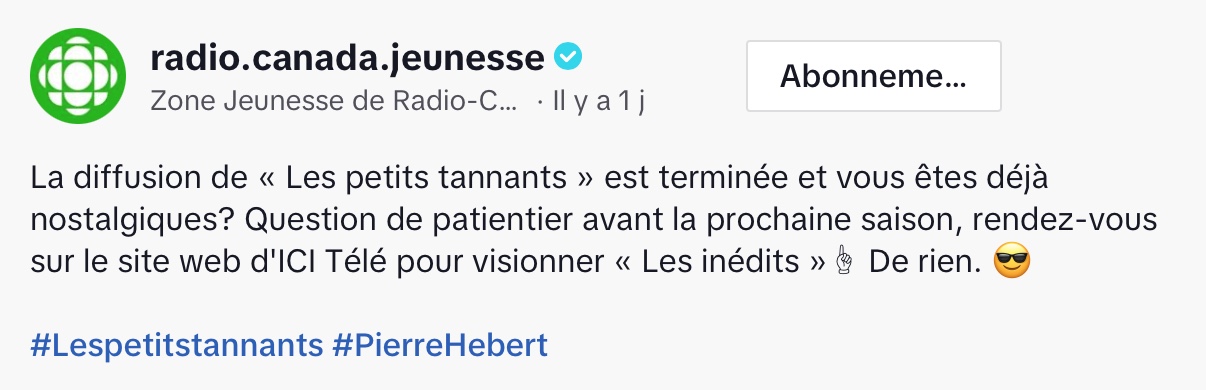 @radio.canada.jeunesse La diffusion de « Les petits tannants » est terminée et vous êtes déjà nostalgiques? Question de patientier avant la prochaine saison, rendez-vous sur le site web d’ICI Télé pour visionner « Les inédits »☝ De rien. 😎 #Lespetitstannants #PierreHebert ♬ son original – Zone Jeunesse de Radio-Canada