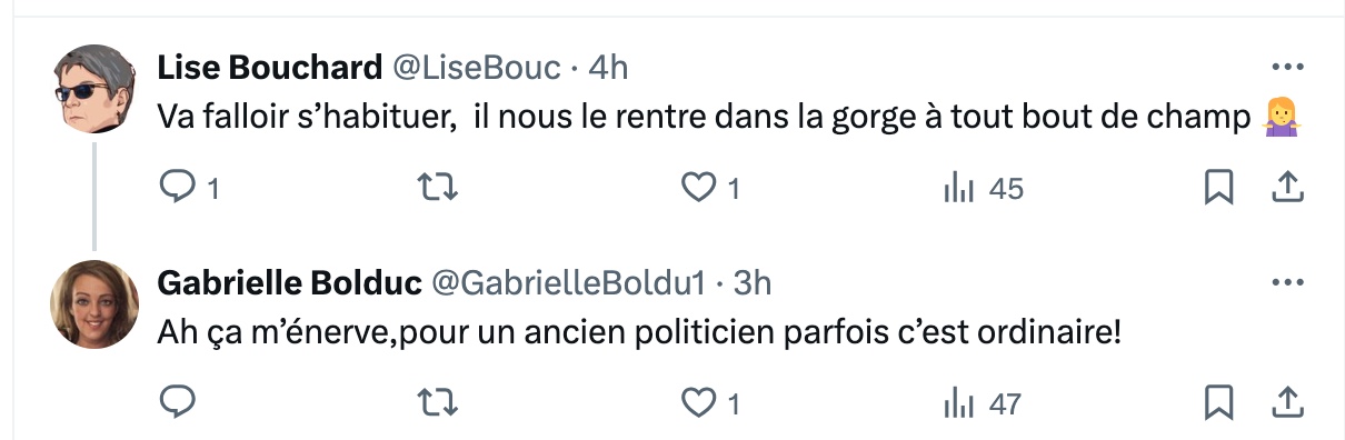 On peut lire dans son message sur X: « Couper l’entrevue sur les crimes violents avec Roger Ferland pour passer GND à l’émission de @mariodumont quel manque de classe, de plus en plus souvent! ».