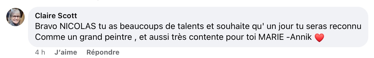 Elle en profite pour nous présenter l’artiste Nicolas Smith âgé de 19 ans qui a offert cette toile à Marie-Annick: Aujourd’hui, j’ai eu la chance de rencontrer Nicolas Smith, 19 ans, qui voulait m’offrir cette toile. Magnifique ! Quel talent !