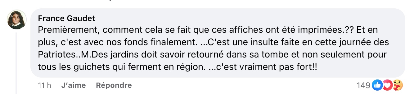 Paul St-Pierre Plamondon a demandé des explications:En attendant que Desjardins s’explique sur cette affiche invraisemblable du jour des patriotes avec le drapeau canadien dans au moins trois de ses succursales, j’aurais la question suivante pour @DesjardinsCoop: en comptant le département de marketing, le département de graphisme, et tous les employés des succursales qui ont mis en place ces affiches, combien d’employés au total chez Desjardins ont conçu, vu, utilisé ou installé ces affiches pour le jour des patriotes en ayant aucune notion historique sur le Québec ni aucune idée qu’il y a quelque chose qui cloche ?