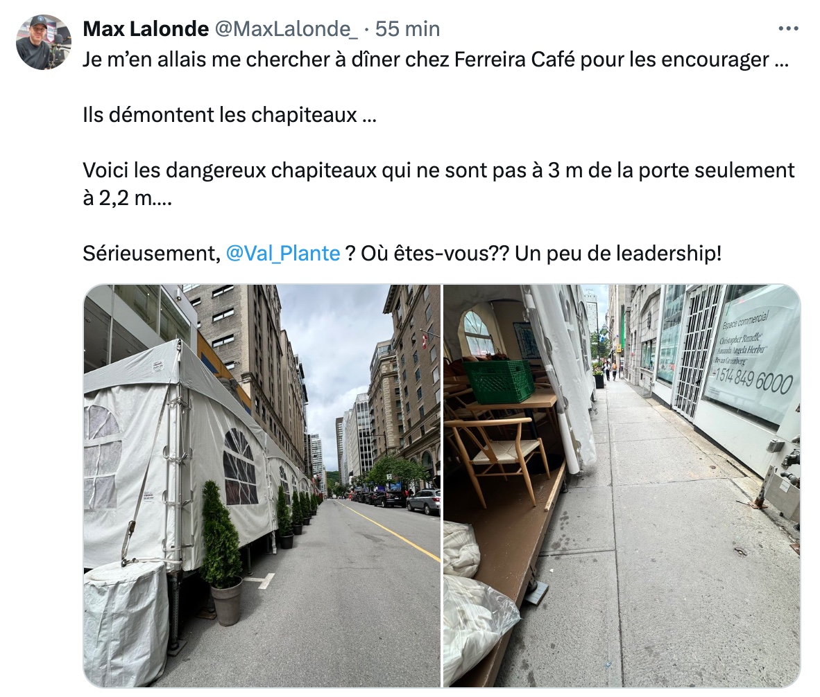 Sandra Ferreira, la directrice des opérations du Ferreira Café situé sur la rue Peel à Montréal, a lancé un vibrant cri du cœur sur son compte Instagram. Elle explique que des pompiers de Montréal sont débarqués à son restaurant pour demander de fermer la terrasse immédiatement.