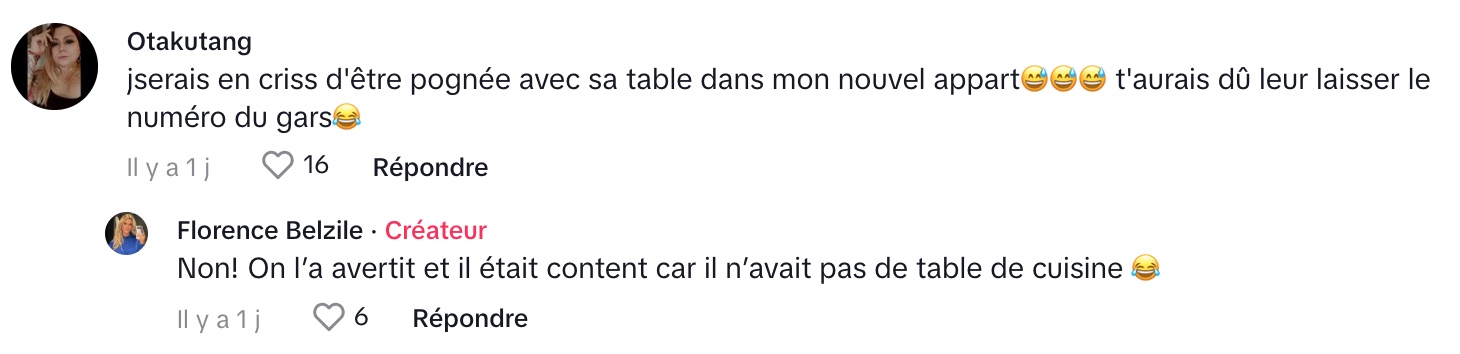 Pendant qu’on est en train de manger, sa mère l’appelle et elle dit: ils sont en train de me négocier le prix. Juste pour déménager la table, c’est 300 $. On a arrêté de manger et on est revenu à l’appart. Ça faisait, je pense, une heure, une heure et demie qu’il était dans l’appartement à rien faire. Il n’avait rien déménagé!