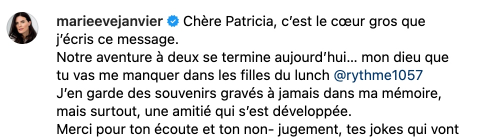 Vous saisirez que ce n’est pas ma décision, mais bien un changement de stratégie d’antenne. La vie est ainsi faite. Rythme aura tout de même été une belle histoire humaine pour moi…Parce que j’y ai côtoyé des personnes de qualité qui vont me manquer. Et toi Marie-Eve, douce, intelligente, bienveillante, conne à souhait. Tu m’as fait le cadeau précieux d’une amitié et c’est ce qui va demeurer de nous…