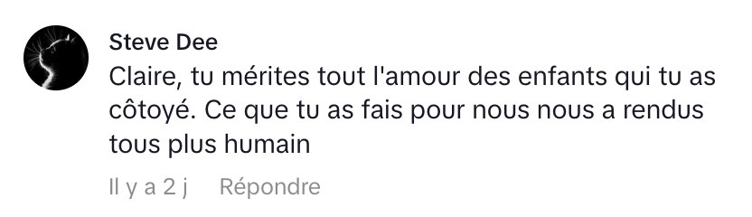 Et tu as un plein d’amour incroyable que tu sais pas pourquoi c’est là, parce que tu n’as pas l’impression que tu as fait quelque chose qui mérite autant d’amour. Mais en même temps, quand j’ai fait les spectacles après plusieurs années, j’ai fait 2000 représentations de spectacles avec mes danses, exercices pour enfants.