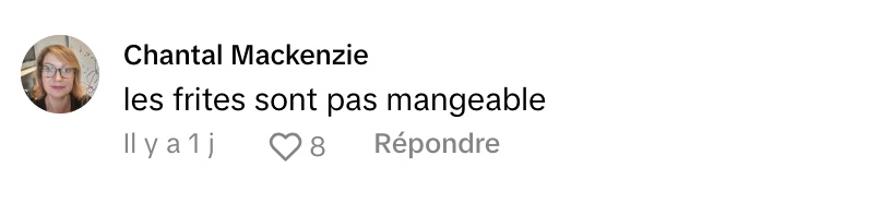 Le président de St-Hubert lui répond que dans les salles à manger les frites sont délicieuses, mais c’est certain que ce n’est pas pareil quand on fait la livraison dans une boîte en carton. Il ajoute que depuis des années ils font des tentatives pour changer les frites, mais les clients veulent que les rôtisseries reviennent aux frites originales.