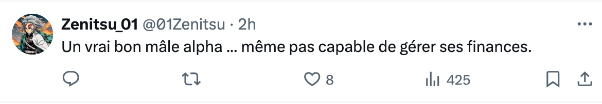 Lors du documentaire Alphas, on peut entendre Julien dire: « «Je suis le pourvoyeur et la seule personne avec des salaires dans ma famille. ». Cet influenceur masculiniste de 36 ans cumule des dettes personnelles de 1.4 million de dollars selon des documents publics du Bureau du surintendant des faillites. Cette information provient du texte de Francis Pilon qui a fait toute une recherche.