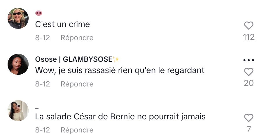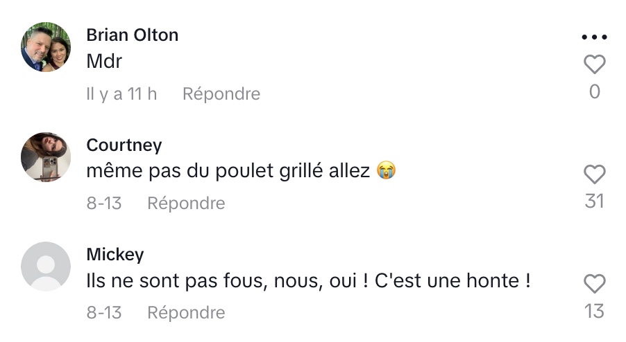 Les commentaires ne se sont pas fait attendre. « C’est un crime », écrit un abonné, tandis qu’un autre ajoute : « Même pas du poulet grillé, allez ! » L’indignation est générale : « Lucille est une véritable arnaque », « J’espère qu’ils vont te donner une carte cadeau », ou encore « C’est pas une salade, c’est dont ben cheap ! »