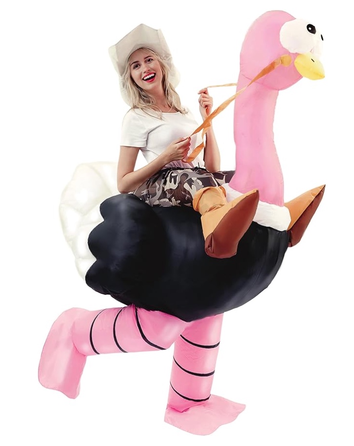 Faites une entrée remarquée avec ce costume gonflable d’autruche, une alternative hilarante au classique cowboy, où vous semblez être en pleine chevauchée sur un oiseau géant. Sa couleur rose fluo accrocheuse garantit que vous attirerez tous les regards et les rires à n’importe quelle fête costumée ou événement d’Halloween!