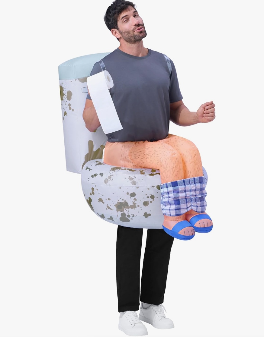 Pour les plus audacieux qui n’ont pas peur de l’autodérision, le costume gonflable « assis sur les toilettes » garantit des fous rires instantanés et fera de vous la vedette incontestée de n’importe quelle fête d’Halloween ou événement de cosplay. C’est le déguisement hilarant ultime pour ceux qui cherchent à rompre avec les classiques et à s’assurer une soirée mémorable où l’humour règne en maître!