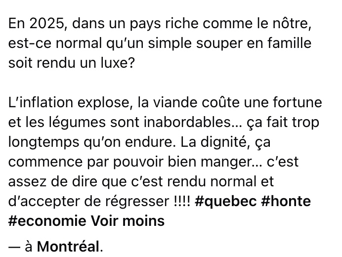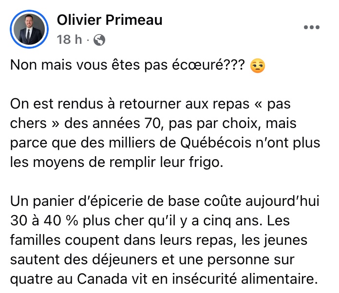 Il pose la question choc : « En 2025, dans un pays riche comme le nôtre, est-ce normal qu’un simple souper en famille soit rendu un luxe? » Pour Primeau, la situation est inacceptable. Il conclut en exigeant que l’on cesse de normaliser cette régression, car « La dignité, ça commence par pouvoir bien manger. » Son cri du cœur utilise les mots-clics #honte et #economie pour interpeller les autorités.