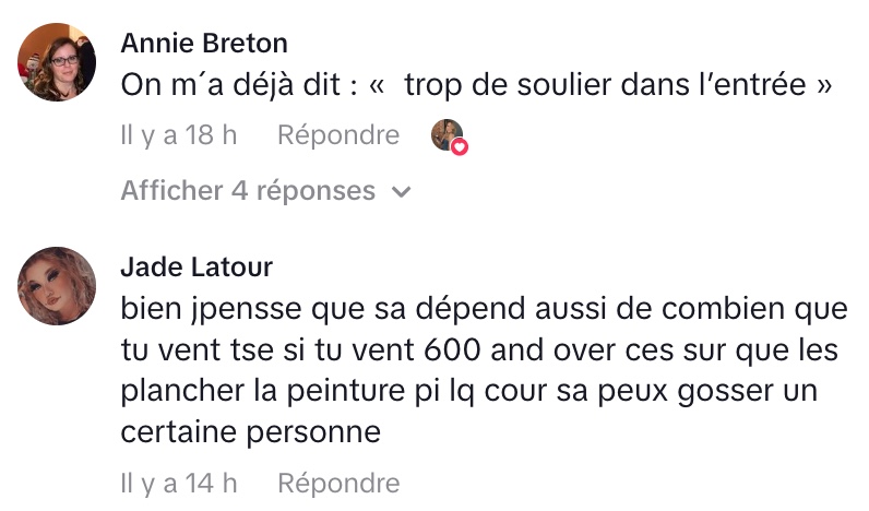 Dans son TikTok intitulé « Défoule-toi avec moi », Joanie partage sa frustration face au processus décourageant de la vente de sa maison. Elle dresse la liste des commentaires négatifs reçus suite aux visites, pointant du doigt des remarques sur des planchers différents, une cour sans aménagement (pas de piscine), une porte-patio sale et de la peinture légèrement défraîchie.