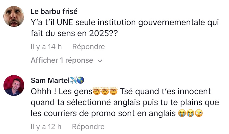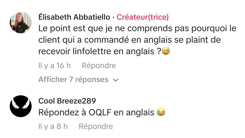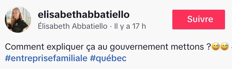 Élisabeth Abbatiello a partagé sur TikTok une anecdote qui l’a fait sourire : la réception d’un courriel de l’OQLF (Office québécois de la langue française) l’informant d’une plainte concernant l’utilisation de l’anglais. La plainte visait un « imprimé de nature commerciale » reçu par un client sous forme d’une infolettre en anglais.