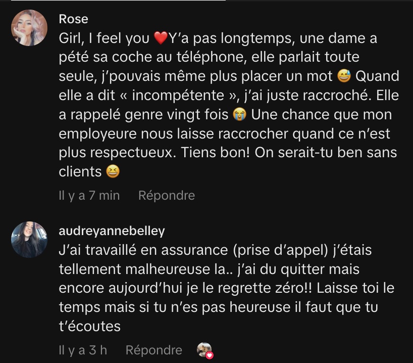 Malgré ses efforts et son stress permanent, elle se sent dépassée et anticipe avec impatience sa transition prochaine au service partenaire, où elle travaillera avec des conseillers, espérant une expérience « moins pire » qu’avec les clients directs. Elle termine en saluant le courage de ceux qui persévèrent dans ce domaine, reconnaissant l’intensité et la difficulté du travail au service client.