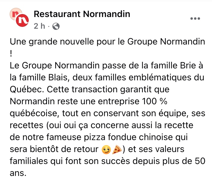 Le Groupe Normandin, une institution québécoise bien-aimée, entame une nouvelle ère avec une transaction majeure. L’entreprise passe des mains de la famille Brie à celles de la famille Blais et de son holding, Chêne Blanc. Ce changement de garde est une excellente nouvelle qui assure que Normandin demeure une entreprise 100 % québécoise. Plus de 50 ans d’histoire et de succès familial se poursuivent, car la nouvelle direction s’engage à conserver l’équipe, les valeurs et surtout les recettes emblématiques qui ont fait la renommée du groupe. D’ailleurs, les fidèles clients seront ravis d’apprendre que la fameuse pizza fondue chinoise fera bientôt son grand retour sur les menus.