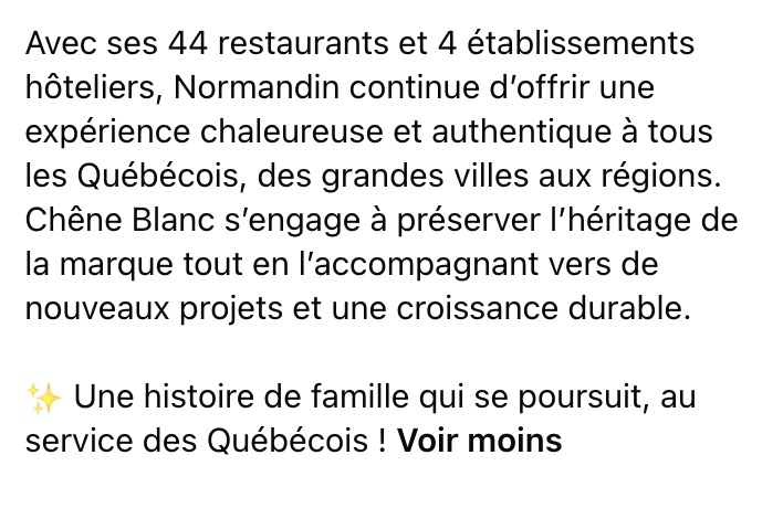 Avec un réseau impressionnant de 44 restaurants et 4 établissements hôteliers, Normandin est un pilier de la restauration et de l’hébergement, offrant une expérience chaleureuse et authentique à travers tout le Québec, des centres urbains aux régions. Le nouvel acquéreur, Chêne Blanc, se positionne comme un garant de cet héritage. L’engagement est clair : préserver l’identité forte de la marque tout en l’orientant vers l’avenir. La famille Blais promet de soutenir le Groupe Normandin dans de nouveaux projets et une croissance durable, assurant ainsi sa pérennité.