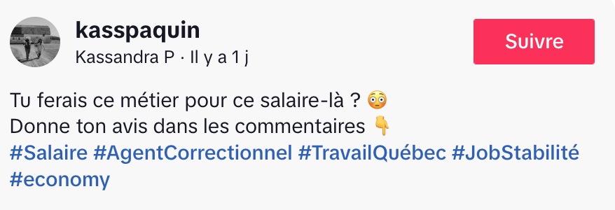 @kasspaquin Tu ferais ce métier pour ce salaire-là ? 😳 Donne ton avis dans les commentaires 👇 #Salaire #AgentCorrectionnel #TravailQuébec #JobStabilité#economy ♬ son original – Kassandra P