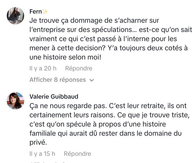 Ce choix remet en question les valeurs familiales mises de l’avant par l’entreprise, provoquant une vague de commentaires négatifs et un désintérêt des consommateurs. Vale exhorte la Maison Lavande à s’exprimer rapidement, car elle prédit un « crash assuré » pour la marque, car « ce ne sera plus jamais comme avant. » Elle conclut en souhaitant bonne chance aux sœurs Ferron, qui bénéficient d’un soutien massif pour leur futur projet.