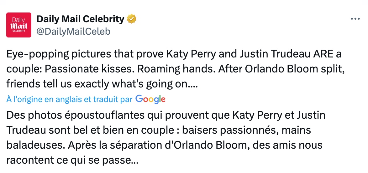 Sur les photos, on voit Justin Trudeau (53 ans) et Katy Perry (40 ans) s’enlacer et s’embrasser. Trudeau pose même les mains sur le postérieur de l’interprète de I Kissed a girl. Les rumeurs d’idylle circulaient déjà depuis l’été, lorsque le couple avait été aperçu au restaurant montréalais Le Violon et que l’ex-Premier ministre avait assisté à un spectacle de la pop star au Centre Bell.