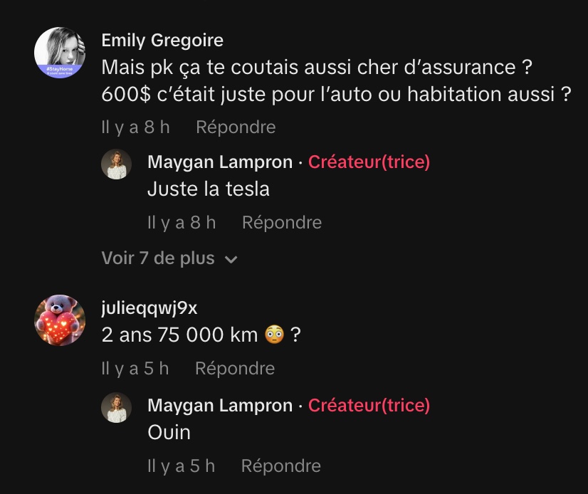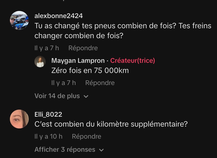 Maygan a décidé de mettre fin à son contrat de location de Tesla, non pas parce qu’elle n’aimait pas la voiture, mais en raison d’un excès de kilométrage important accumulé en deux ans. Elle louait la Tesla pour une durée de deux ans avec un certain nombre de kilomètres autorisés, mais ses déplacements fréquents pour voir des amis (des « gars qui habitaient à Saint-Moukmouk ») ont causé un dépassement qu’elle estime trop coûteux à la fin du contrat.