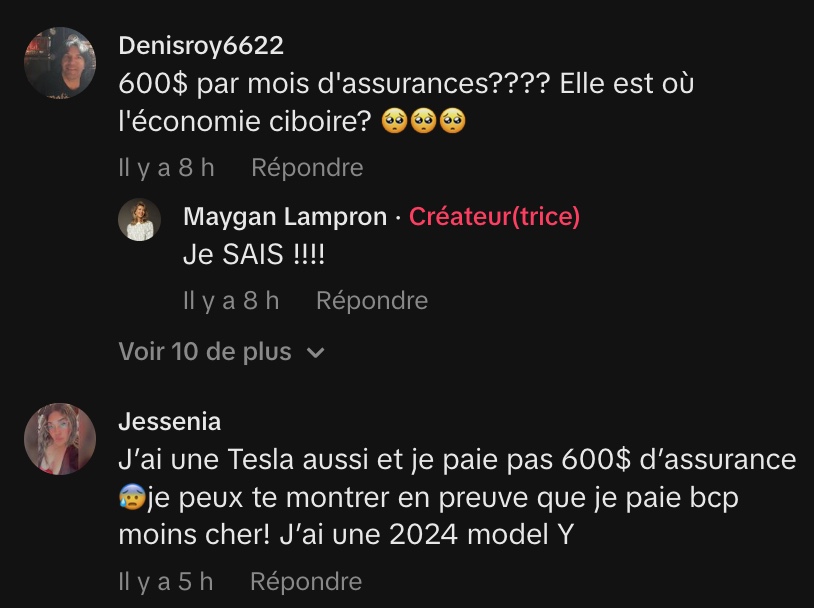Le seul point très négatif qu’elle soulève concerne les assurances de la Tesla, qui lui coûtaient 600 $par mois. Elle a depuis opté pour une BMW, une voiture plus chère (évaluée à près de 93 000$ avec options, contre 65 000 pourlaTesla),mais dont l’assurance ne lui coûte que 250 par mois.