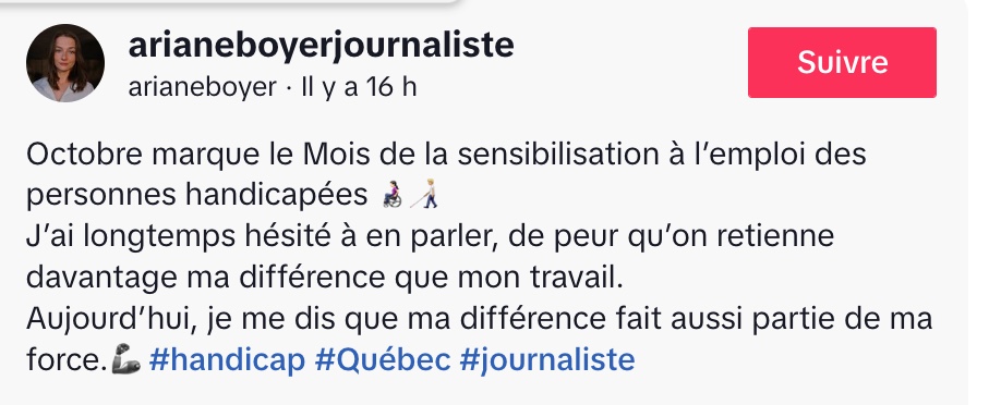 @arianeboyerjournaliste Octobre marque le Mois de la sensibilisation à l’emploi des personnes handicapées 👩🏻🦽🧑🏼🦯 J’ai longtemps hésité à en parler, de peur qu’on retienne davantage ma différence que mon travail. Aujourd’hui, je me dis que ma différence fait aussi partie de ma force.🦾 #handicap #Québec #journaliste ♬ son original – arianeboyer