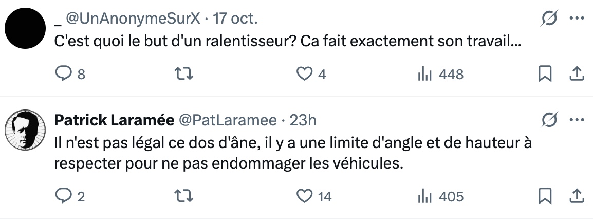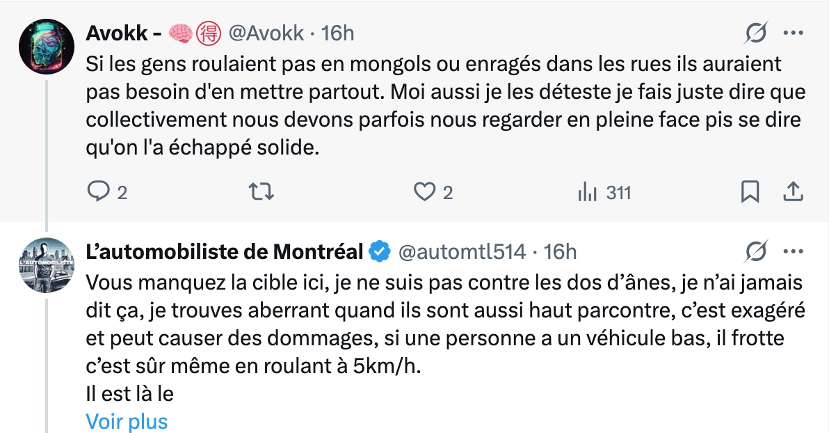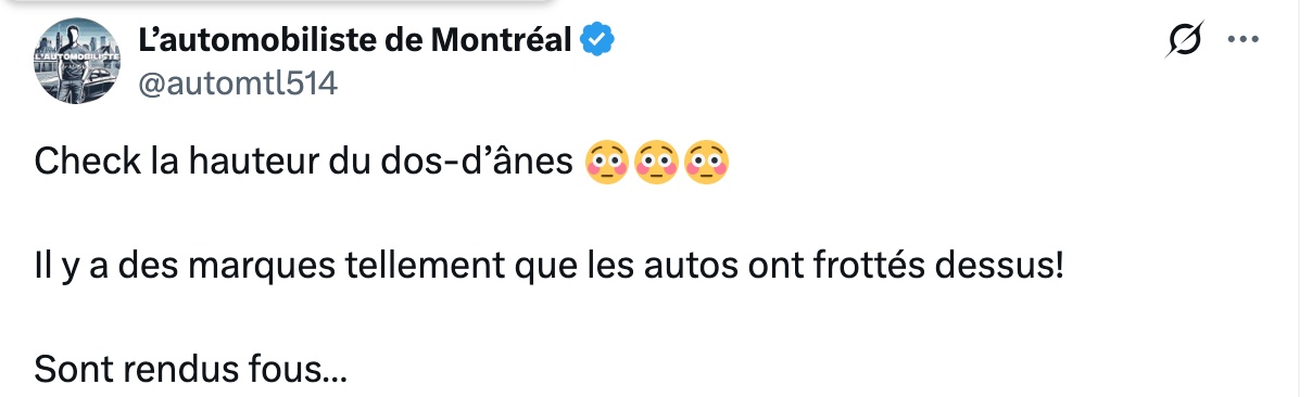 En commentaires, le débat est lancé : certains estiment que de tels aménagements sont nécessaires pour freiner les conducteurs trop pressés, d’autres jugent la structure exagérée et mal conçue. « Ça n’a pas de sens ! », écrit un internaute, tandis qu’un autre ironise : « Vive la vie en région, sti ! » Entre humour, frustration et exaspération, cette simple bosse dans la rue résume parfaitement les tensions entre sécurité routière et confort de conduite à Montréal.