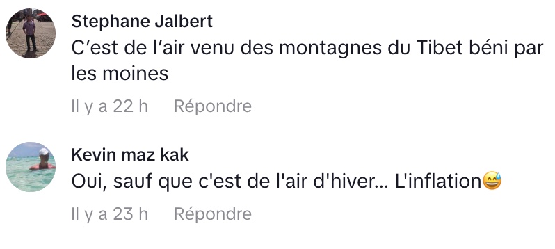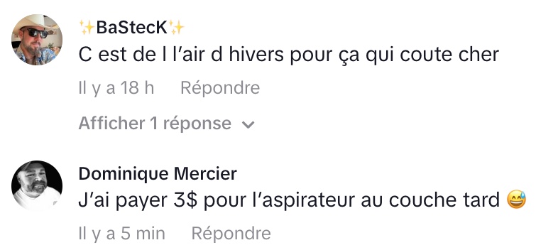 Dans les commentaires, certains plaisantent : « C’est de l’air d’hiver, c’est pour ça que ça coûte cher », « J’ai payé 3 $ pour l’aspirateur au Couche-Tard », ou encore « Bientôt ils vont offrir ça sur quatre versements égaux ». Une petite scène du quotidien qui résume parfaitement la frustration moderne face à la hausse des prix.