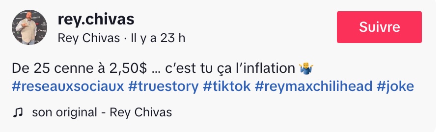 @rey.chivas De 25 cenne à 2,50$ … c’est tu ça l’inflation 🤷♂️ #reseauxsociaux #truestory #tiktok #reymaxchilihead #joke ♬ son original – Rey Chivas