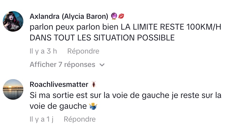 Excédé par cette obstruction et par l’inaction du conducteur, Fél Roy finit par doubler par la droite, une manœuvre qu’il justifie par la nécessité et l’exemple d’autres automobilistes. Il insiste sur le fait qu’il ne faut pas « faire chier tout le monde en imposant [sa] vitesse » sur la voie de dépassement. Il conclut, de manière humoristique mais ferme, en menaçant d’imposer sa propre vitesse, tout en précisant qu’il s’agit d’une blague pour éviter tout problème avec la police.